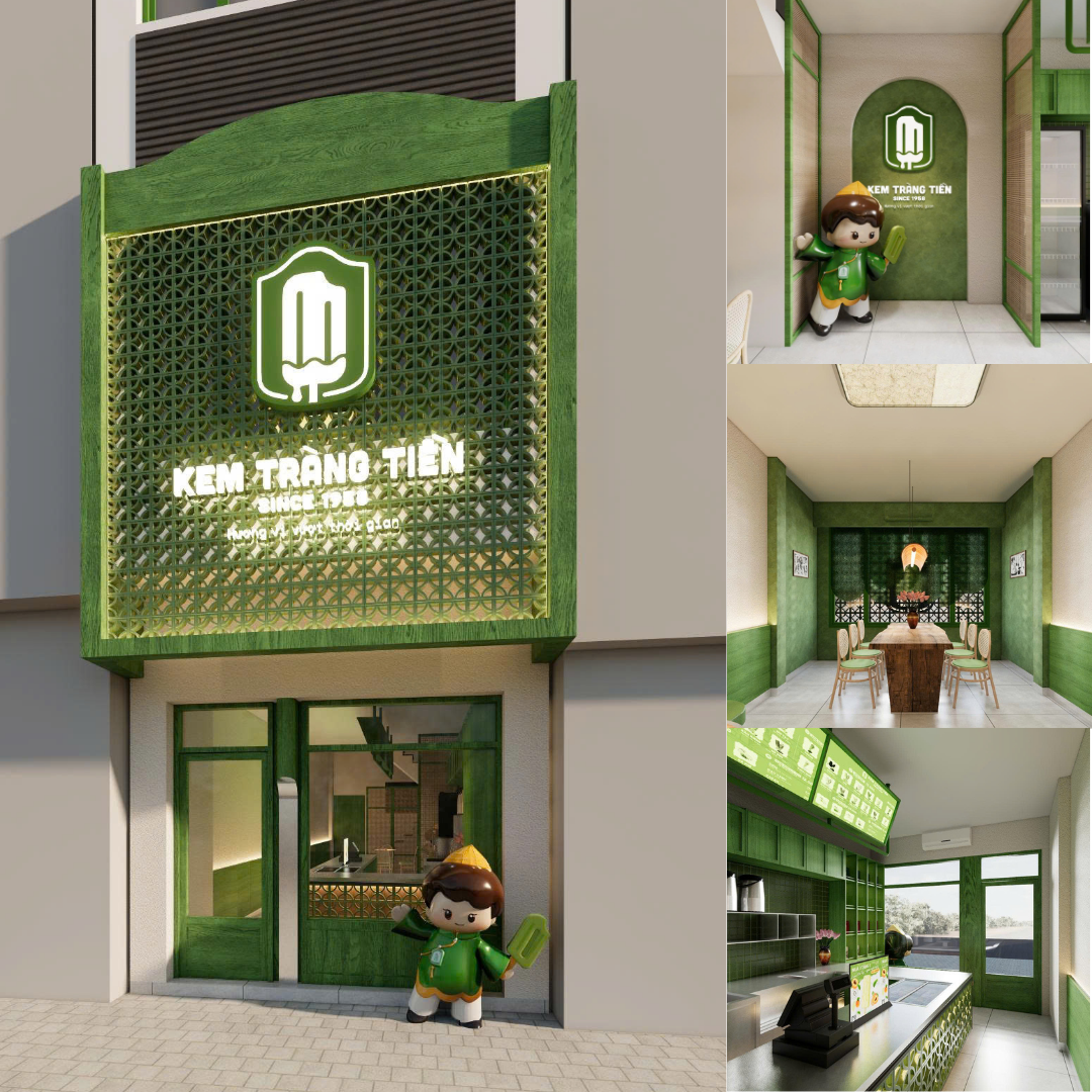 Giữa nhịp sống sôi động của phố mới, Kem Tràng Tiền mang đến một không gian gợi nhắc mái nhà xưa của người Việt: gạch bông gió, gỗ mộc mạc, chiếc nón lá thân quen. Đây không chỉ là một cửa hàng, mà là một “ngôi nhà di sản” – nơi ký ức và sáng tạo gặp nhau.
