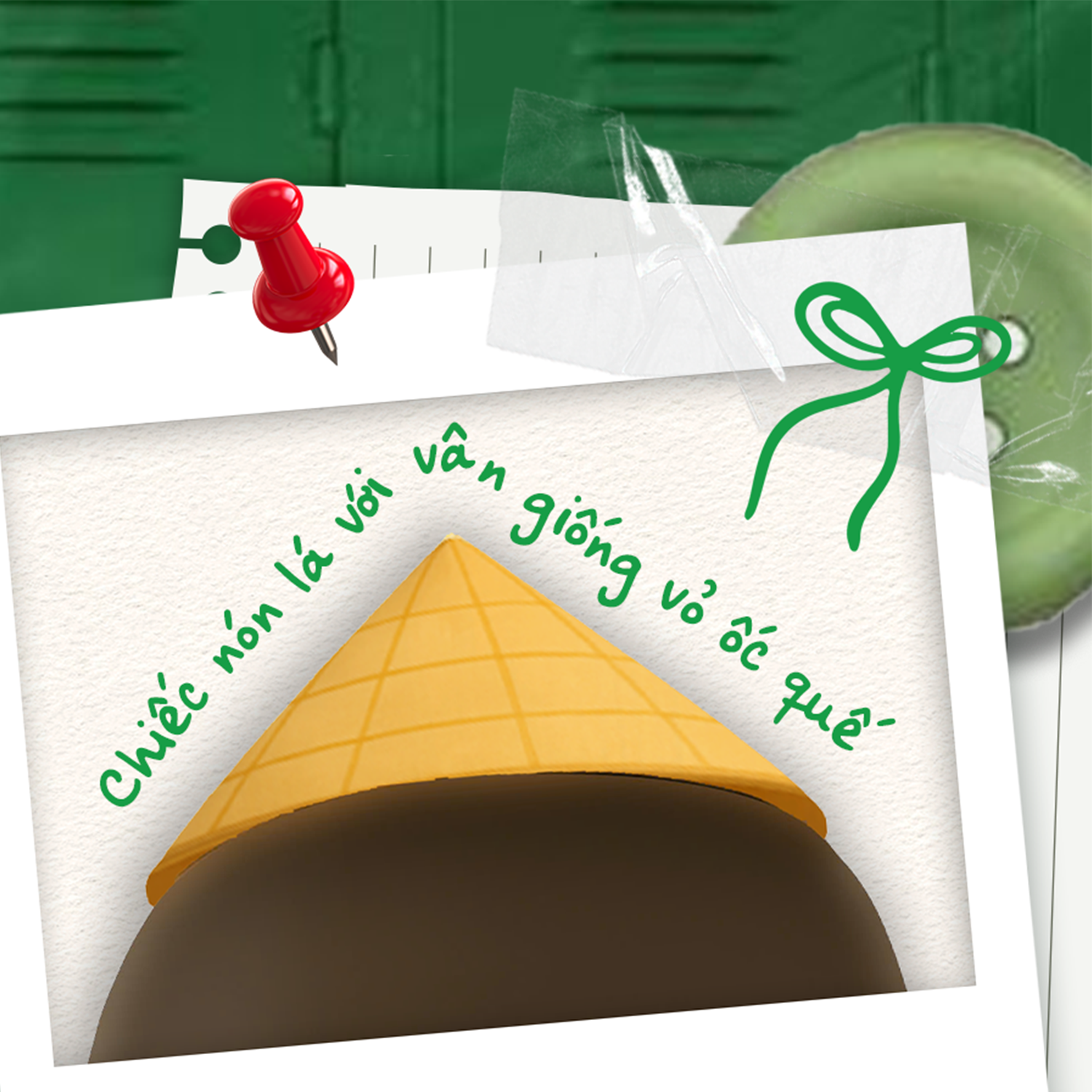 ▪️ Đội trên đầu chiếc nón lá cách điệu, với những đường vân mềm mại gợi nhớ đến lớp vỏ ốc quế giòn tan quen thuộc.